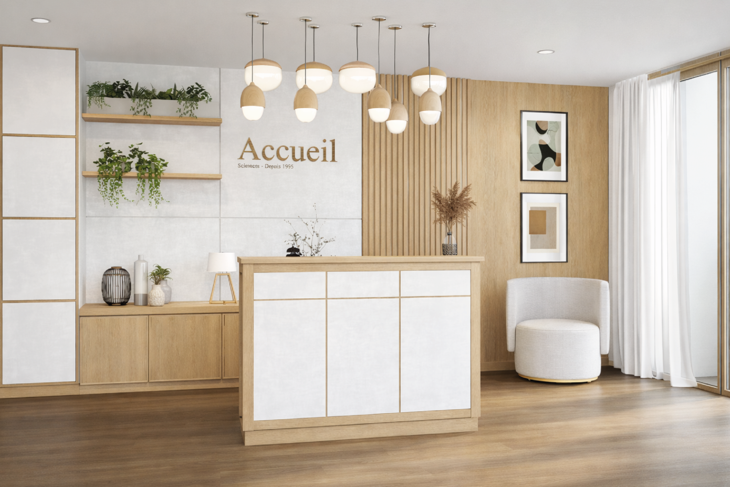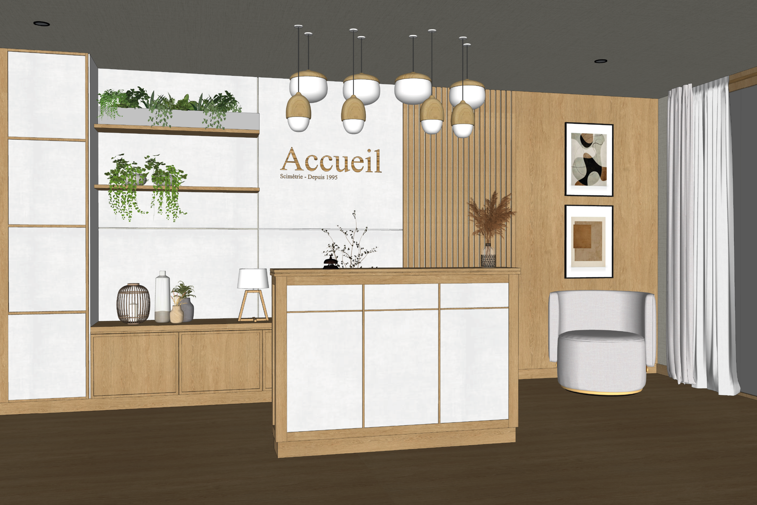 Scimétrie conçoit pour vous des plans techniques d’agencement et de mobilier, des modèles 3D fonctionnels et des rendus photoréalistes afin de faciliter la préparation, la validation et la visualisation de vos projets d’aménagement.